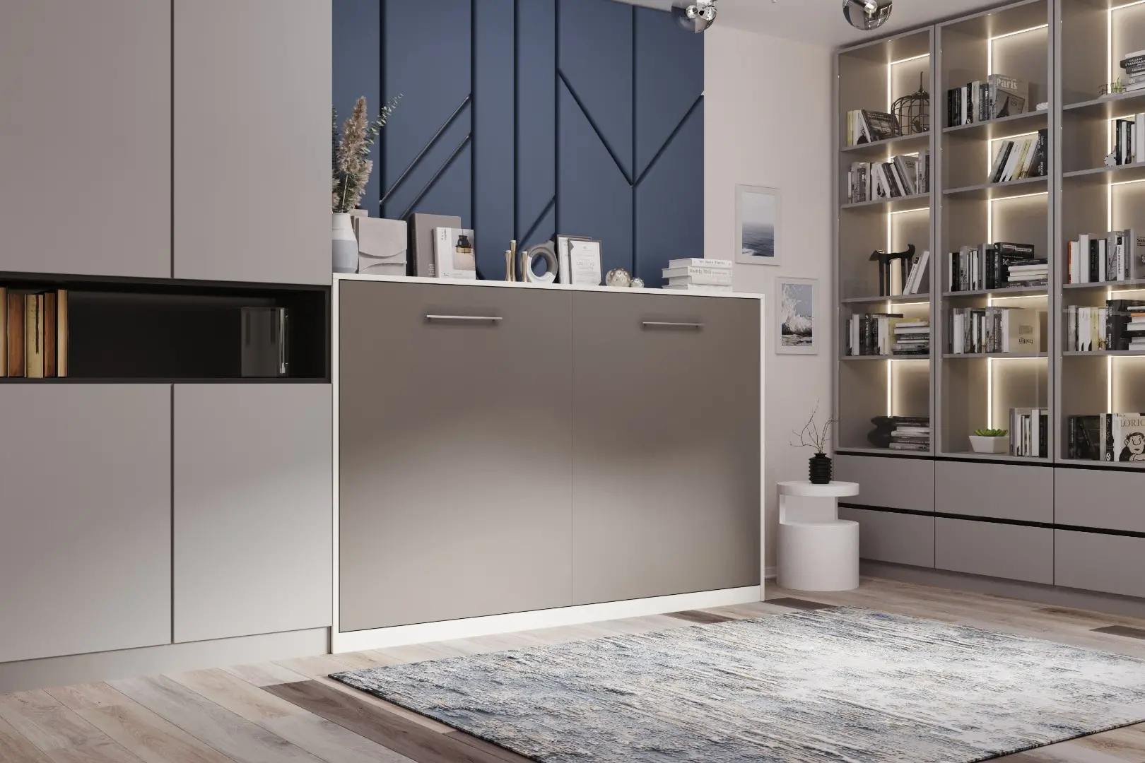 Горизонтальная шкаф-кровать "Solo Start".  Работает на механизме раскладывания собственной разработки "Start". Кровать раскладывается легким движением руки, превращаясь в полноценное спальное место. Просто потяните ее за ручки, расположенные на фасаде и выставите ножки-опоры.
